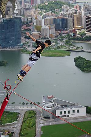 看了以後讓我熱血沸騰。雖然我在澳洲凱恩斯已經玩過高空跳傘了,但是高空跳傘給我的感覺與其說是「墜落」,更不如說是「飛翔」,而且在接近地面之前傘就已經撐開了。所以那次以後我就一直很想試一次高空彈跳,體會看看真正「墜落」的感覺。偶然間看到Youtube的這支影片才知道澳門竟然有這種東西,而且還號稱是世界最高的高空彈跳。要玩當然就要玩最高的囉!我抱著滿腔的熱血,第二天上班時就跑去找同部門的朋友武田氏。
