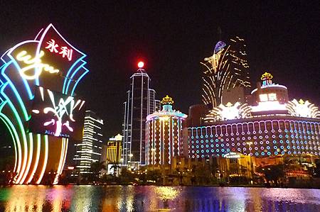 然後慢慢的邁入夜色。澳門美麗的夜景也如畫般慢慢浮現。澳門的夜景是我看過最醉人而且夢幻的。你會驚訝於人類竟然可以打造出的一個如此風華、糜爛的世界。跟白天比起來,夜晚的澳門彷彿是夢境的世界,到處充滿酒樂歌舞聲。相較於白天的歷史古城,夜晚的澳門是個酒醉金迷的不夜城。